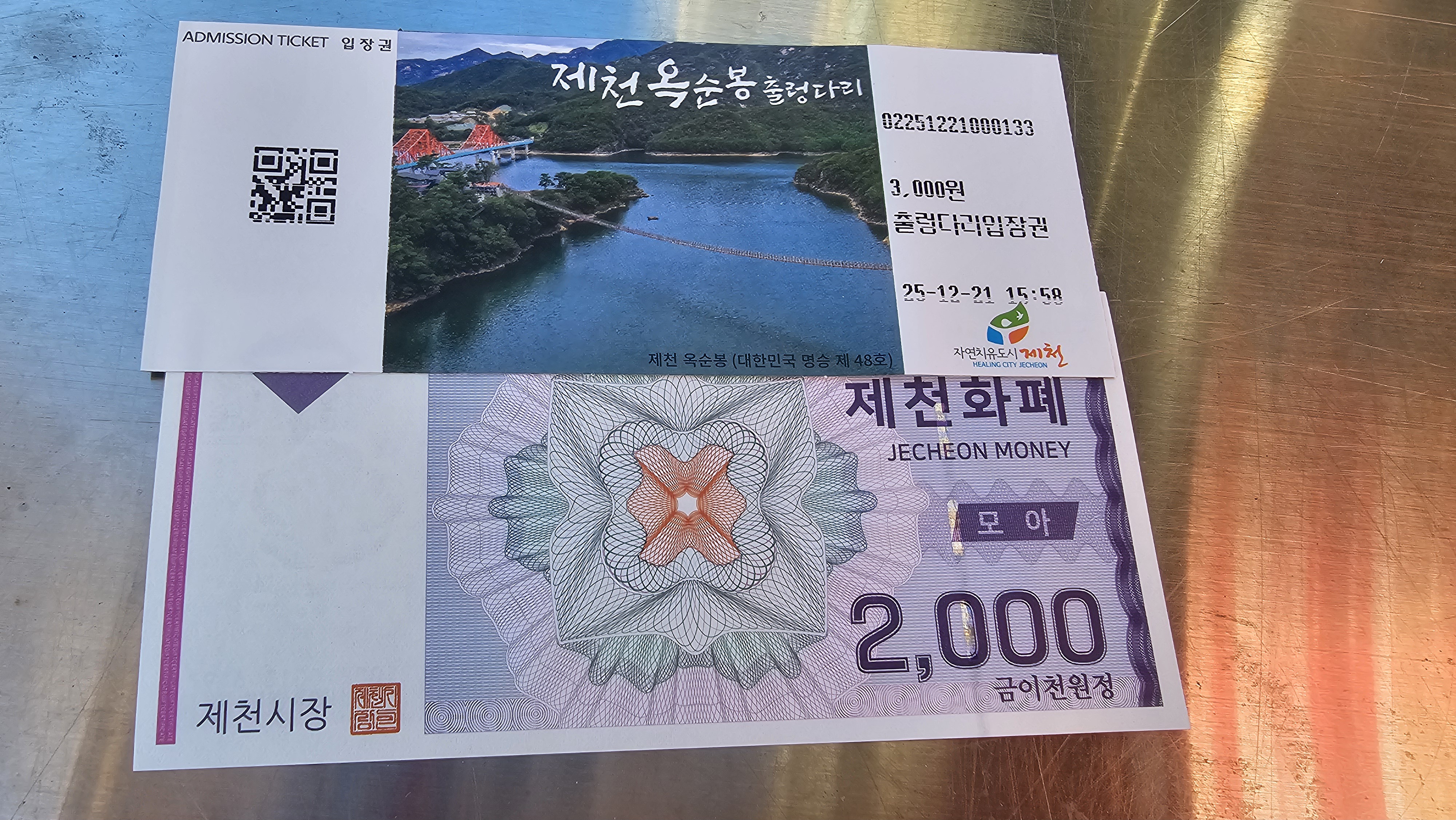 옥순봉 출렁다리는 매번 늦은 시간에 도착해 못봤는데, 오늘도 1시간 정도의 여유도 없이 급하게 돌아나왔다. 1인 3,000원의 입장귄을 사니 2,000원을 지역화폐로 돌려주었다.